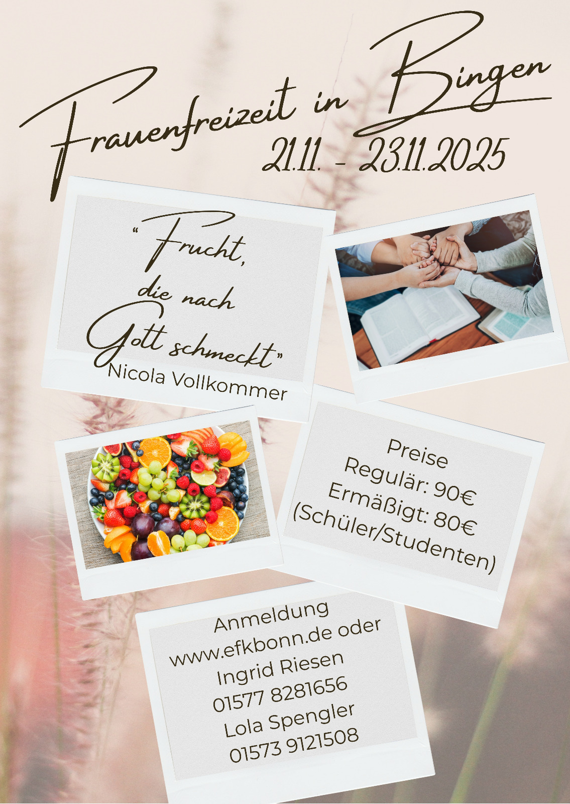 Frauenfreizeit in Bingen 2025 von Lola Spengler | Okt. 5, 2025 Upcoming Dates 21 Nov Frauenfreizeit in Bingen 2025 Frucht die nach Gott schmeckt - Nicola Vollkommer 17:00 - 12:00 Details Price Qty Reguläres Ticketshow details +hide details - €90,00 EUR Select this ticket Details Ein Regüläres Ticket für die gesamte Aufenthaltsdauer. Price Name Description Amount Reguläres Ticket €90,00 EUR Total €90,00 EUR Sale Dates - The dates when this option is available for purchase. Goes On Sale: 5. Oktober 2025 8:00 Sales End: 2. November 2025 23:59 Access - This option allows access to the following dates and times. Date Time Frauenfreizeit in Bingen 2025 21. November 2025 to 23. November 2025 17:00 to 12:00 Ermäßigtes Ticketshow details +hide details - €80,00 EUR Select this ticket Details Für Schüler und Studenten Price Name Description Amount Ermäßigtes Ticket €80,00 EUR Total €80,00 EUR Sale Dates - The dates when this option is available for purchase. Goes On Sale: 5. Oktober 2025 8:00 Sales End: 2. November 2025 23:59 Access - This option allows access to the following dates and times. Date Time Frauenfreizeit in Bingen 2025 21. November 2025 to 23. November 2025 17:00 to 12:00 please do not enter anything in this input